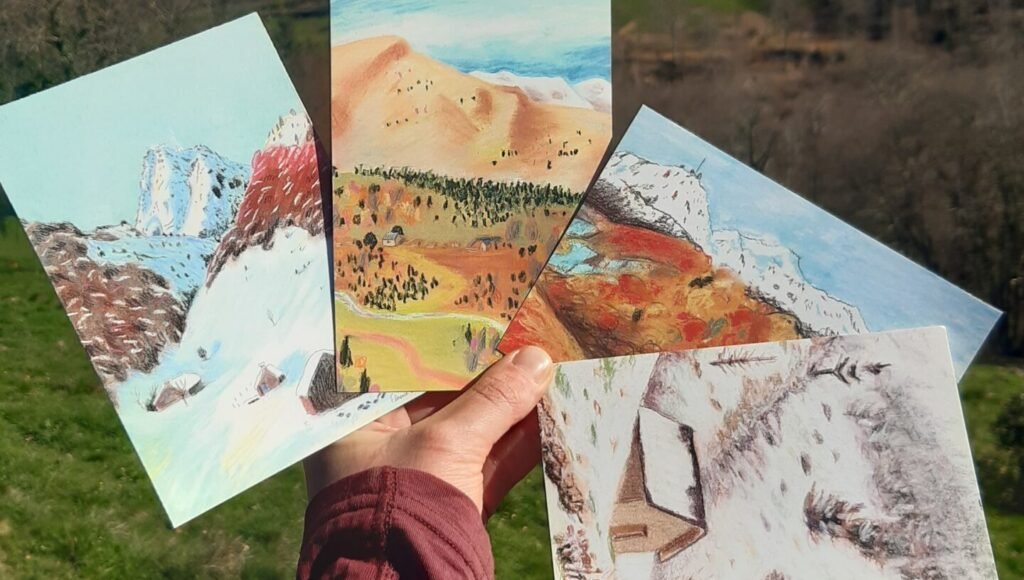 Les cartes postales « Cabanes des Pyrénées – série été » sont dessinées in situ dans les montagnes, et imprimées à Lourdes.