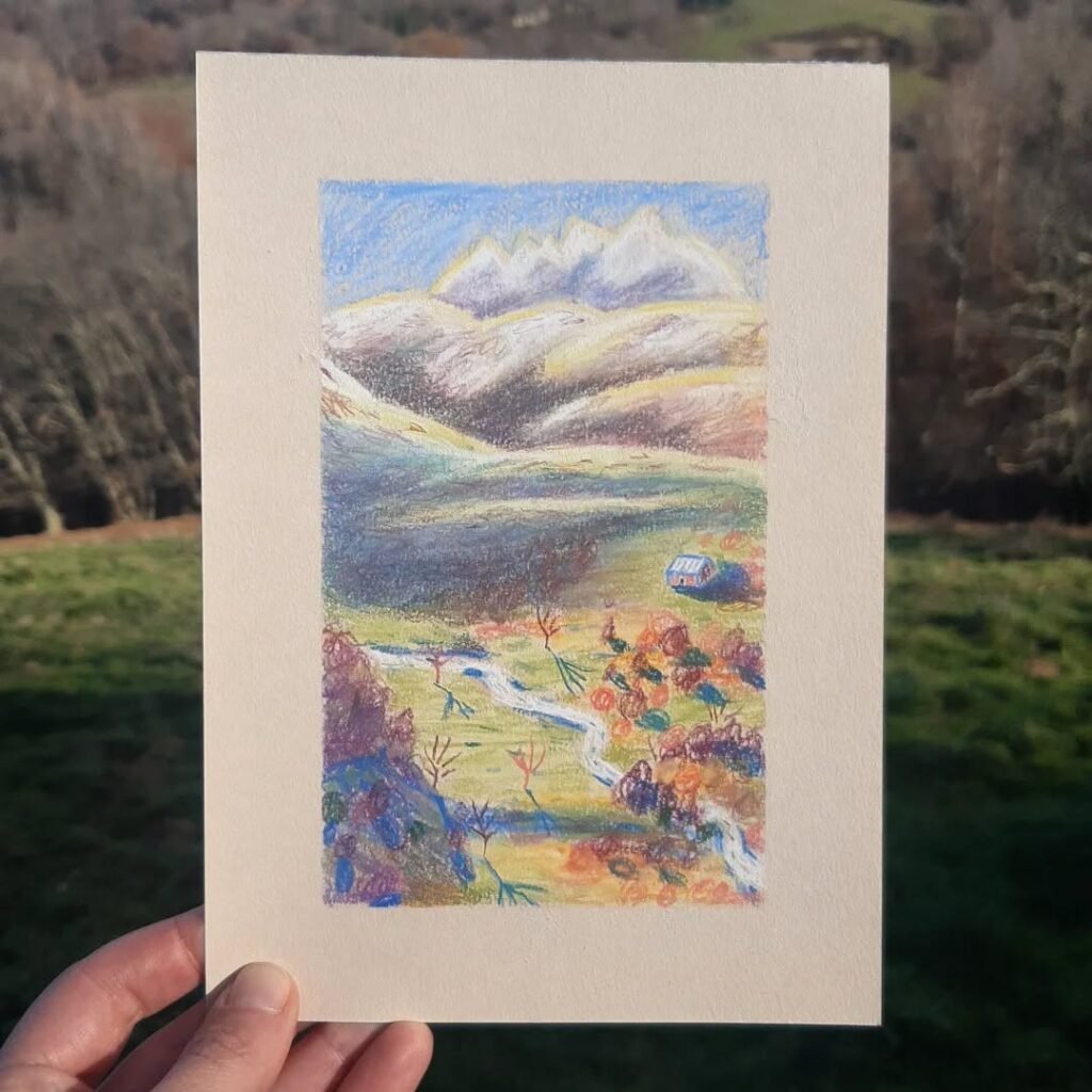 Cabane des EsclozesPar Florence / janvier 27, 2026 Une balade dans le vallon de la cabane des Esclozes (65). Dessin au pastel sec sur papier marron, format A5